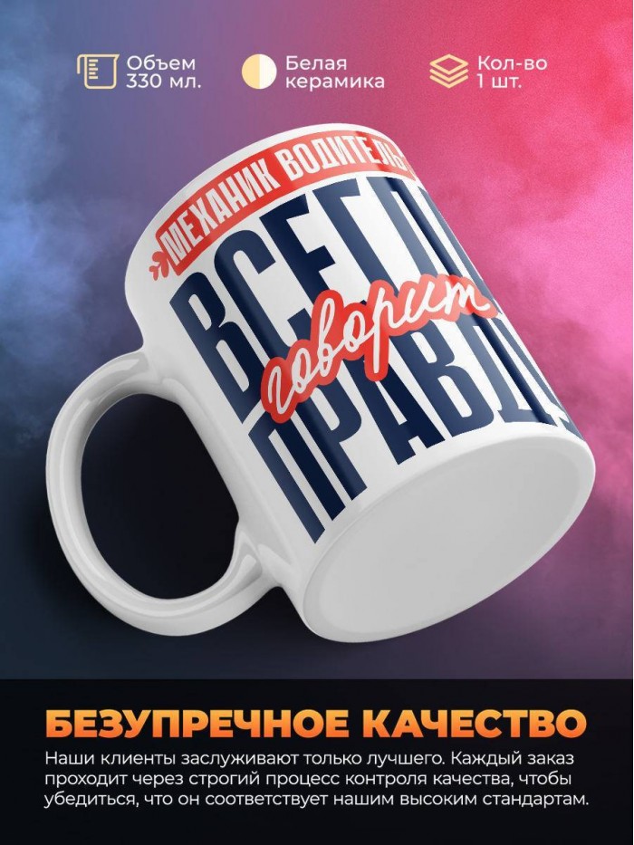 Сувенирная белая кружка с принтом "Механик водитель всегда говорит правду" – отличный подарок родным и близким людям для любого случая. Уникальный дизайн делает ее неповторимой и привлекательной для глаз. Принты могут быть разными: от ярких креативных решений, которые идеально подойдут молодежи, до классических элегантных узоров, радующих взгляд людей любого поколения во время чаепития. Рисунок наносится с использованием специализированного оборудования, материалами, прошедшими испытания на пригодность к использованию в быту.