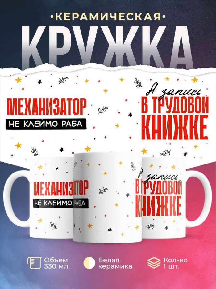 Сувенирная белая кружка с принтом "Механизатор не клеймо раба, а запись в трудовой книжке" – отличный подарок родным и близким людям для любого случая. Уникальный дизайн делает ее неповторимой и привлекательной для глаз. Принты могут быть разными: от ярких креативных решений, которые идеально подойдут молодежи, до классических элегантных узоров, радующих взгляд людей любого поколения во время чаепития. Рисунок наносится с использованием специализированного оборудования, материалами, прошедшими испытания на пригодность к использованию в быту.