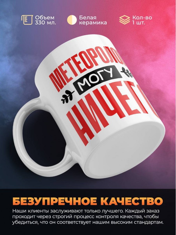 Сувенирная белая кружка с принтом "Метеоролог могу ничего" – отличный подарок родным и близким людям для любого случая. Уникальный дизайн делает ее неповторимой и привлекательной для глаз. Принты могут быть разными: от ярких креативных решений, которые идеально подойдут молодежи, до классических элегантных узоров, радующих взгляд людей любого поколения во время чаепития. Рисунок наносится с использованием специализированного оборудования, материалами, прошедшими испытания на пригодность к использованию в быту.