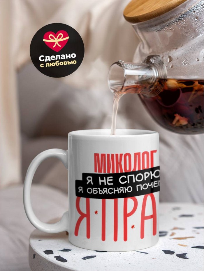 Сувенирная белая кружка с принтом "Миколог я не спорю я объясняю почему я прав" – отличный подарок родным и близким людям для любого случая. Уникальный дизайн делает ее неповторимой и привлекательной для глаз. Принты могут быть разными: от ярких креативных решений, которые идеально подойдут молодежи, до классических элегантных узоров, радующих взгляд людей любого поколения во время чаепития. Рисунок наносится с использованием специализированного оборудования, материалами, прошедшими испытания на пригодность к использованию в быту.