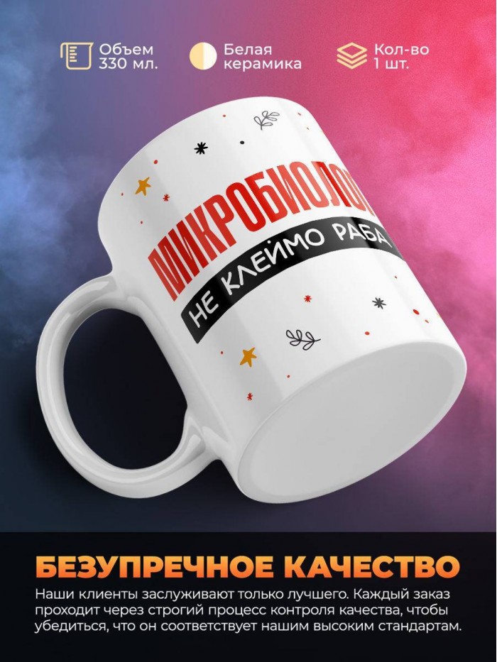 Сувенирная белая кружка с принтом "Микробиолог не клеймо раба, а запись в трудовой книжке" – отличный подарок родным и близким людям для любого случая. Уникальный дизайн делает ее неповторимой и привлекательной для глаз. Принты могут быть разными: от ярких креативных решений, которые идеально подойдут молодежи, до классических элегантных узоров, радующих взгляд людей любого поколения во время чаепития. Рисунок наносится с использованием специализированного оборудования, материалами, прошедшими испытания на пригодность к использованию в быту.