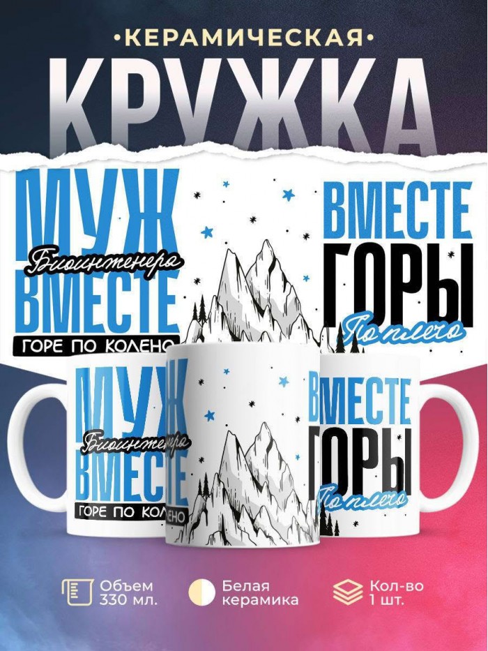 Сувенирная белая кружка с принтом "Муж биоинженера вместе горе по колено вместе горы по плечо" – отличный подарок родным и близким людям для любого случая. Уникальный дизайн делает ее неповторимой и привлекательной для глаз. Принты могут быть разными: от ярких креативных решений, которые идеально подойдут молодежи, до классических элегантных узоров, радующих взгляд людей любого поколения во время чаепития. Рисунок наносится с использованием специализированного оборудования, материалами, прошедшими испытания на пригодность к использованию в быту.