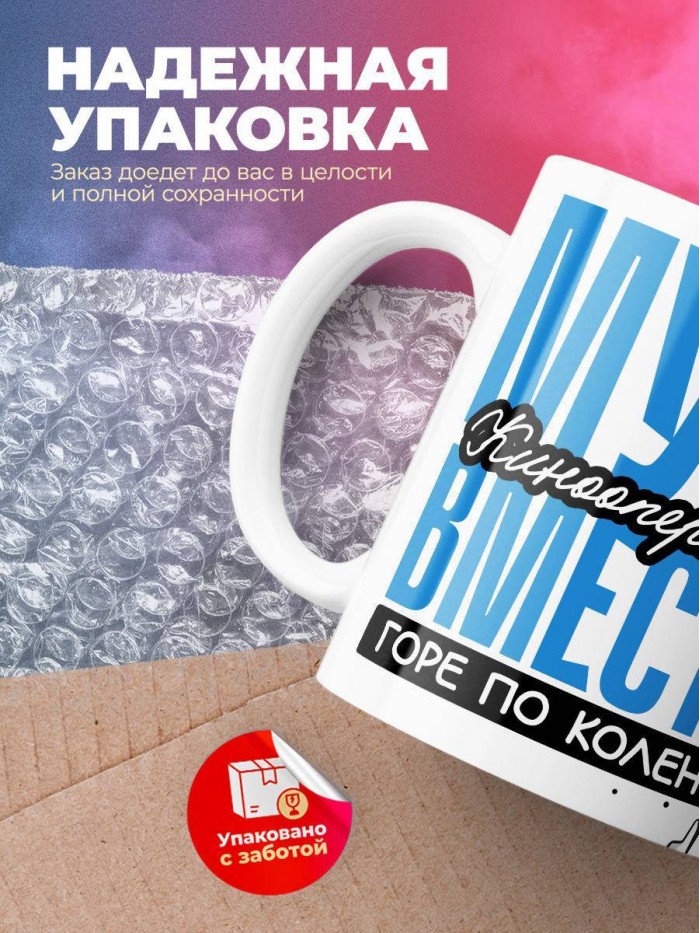 Сувенирная белая кружка с принтом "Муж кинооператора вместе горе по колено вместе горы по плечо" – отличный подарок родным и близким людям для любого случая. Уникальный дизайн делает ее неповторимой и привлекательной для глаз. Принты могут быть разными: от ярких креативных решений, которые идеально подойдут молодежи, до классических элегантных узоров, радующих взгляд людей любого поколения во время чаепития. Рисунок наносится с использованием специализированного оборудования, материалами, прошедшими испытания на пригодность к использованию в быту.