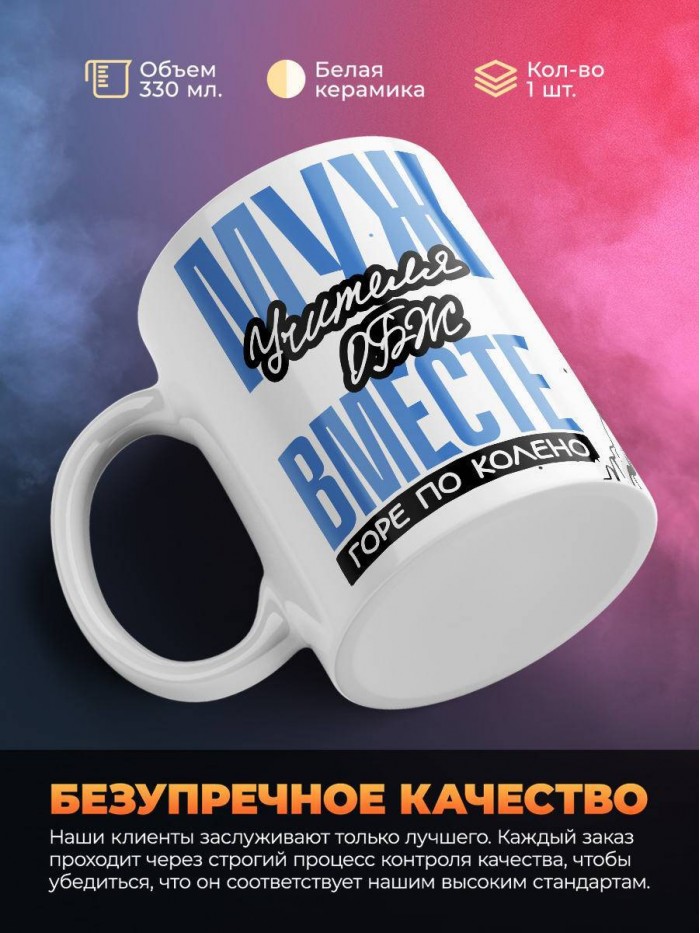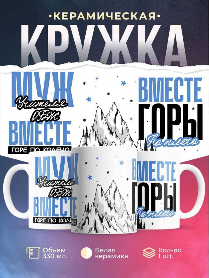 Сувенирная белая кружка с принтом "Муж учителя обж вместе горе по колено, вместе горы по плечо" – отличный подарок родным и близким людям для любого случая. Уникальный дизайн делает ее неповторимой и привлекательной для глаз. Принты могут быть разными: от ярких креативных решений, которые идеально подойдут молодежи, до классических элегантных узоров, радующих взгляд людей любого поколения во время чаепития. Рисунок наносится с использованием специализированного оборудования, материалами, прошедшими испытания на пригодность к использованию в быту.