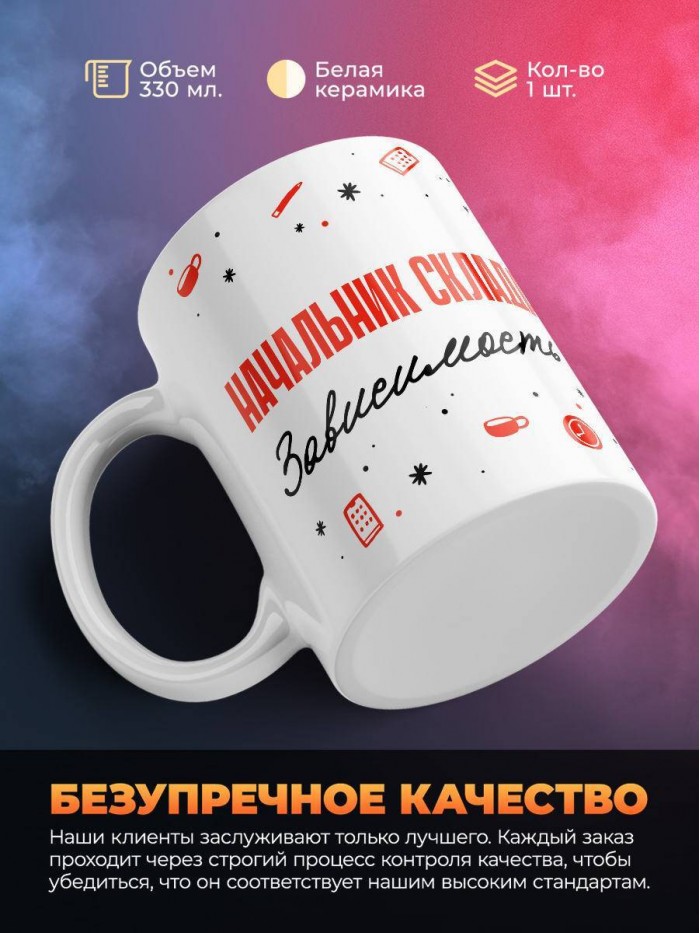 Сувенирная белая кружка с принтом "Начальник склада зависимость" – отличный подарок родным и близким людям для любого случая. Уникальный дизайн делает ее неповторимой и привлекательной для глаз. Принты могут быть разными: от ярких креативных решений, которые идеально подойдут молодежи, до классических элегантных узоров, радующих взгляд людей любого поколения во время чаепития. Рисунок наносится с использованием специализированного оборудования, материалами, прошедшими испытания на пригодность к использованию в быту.