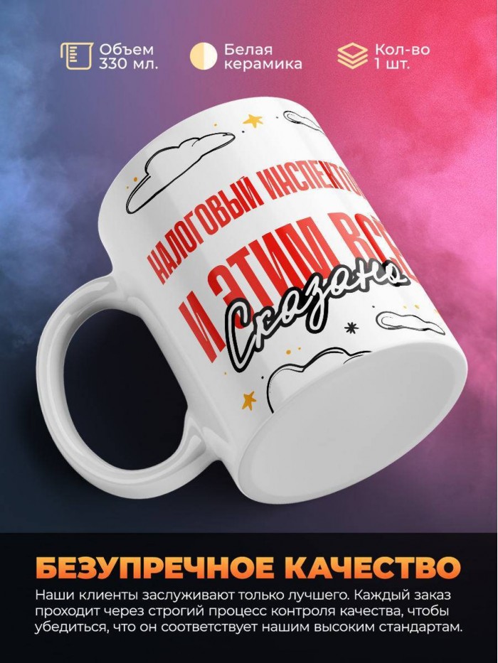 Сувенирная белая кружка с принтом "Налоговый инспектор и этим все сказано" – отличный подарок родным и близким людям для любого случая. Уникальный дизайн делает ее неповторимой и привлекательной для глаз. Принты могут быть разными: от ярких креативных решений, которые идеально подойдут молодежи, до классических элегантных узоров, радующих взгляд людей любого поколения во время чаепития. Рисунок наносится с использованием специализированного оборудования, материалами, прошедшими испытания на пригодность к использованию в быту.