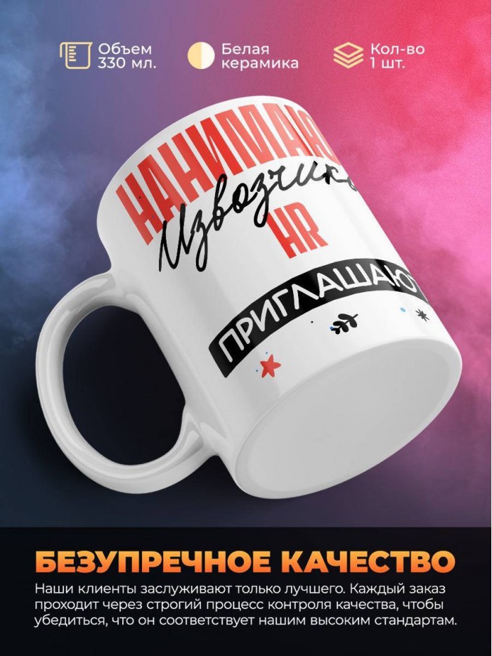 Сувенирная белая кружка с принтом "Нанимают извозчика hr приглашают" – отличный подарок родным и близким людям для любого случая. Уникальный дизайн делает ее неповторимой и привлекательной для глаз. Принты могут быть разными: от ярких креативных решений, которые идеально подойдут молодежи, до классических элегантных узоров, радующих взгляд людей любого поколения во время чаепития. Рисунок наносится с использованием специализированного оборудования, материалами, прошедшими испытания на пригодность к использованию в быту.