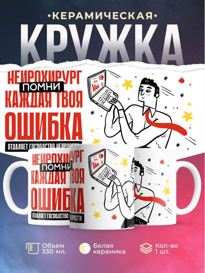 Сувенирная белая кружка с принтом "Нейрохирург помни каждая твоя ошибка отделяет господство нейросети" – отличный подарок родным и близким людям для любого случая. Уникальный дизайн делает ее неповторимой и привлекательной для глаз. Принты могут быть разными: от ярких креативных решений, которые идеально подойдут молодежи, до классических элегантных узоров, радующих взгляд людей любого поколения во время чаепития. Рисунок наносится с использованием специализированного оборудования, материалами, прошедшими испытания на пригодность к использованию в быту.