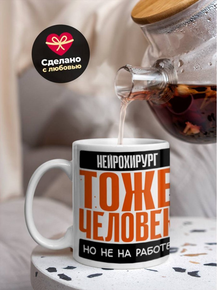 Сувенирная белая кружка с принтом "Нейрохирург тоже человек, но не на работе" – отличный подарок родным и близким людям для любого случая. Уникальный дизайн делает ее неповторимой и привлекательной для глаз. Принты могут быть разными: от ярких креативных решений, которые идеально подойдут молодежи, до классических элегантных узоров, радующих взгляд людей любого поколения во время чаепития. Рисунок наносится с использованием специализированного оборудования, материалами, прошедшими испытания на пригодность к использованию в быту.