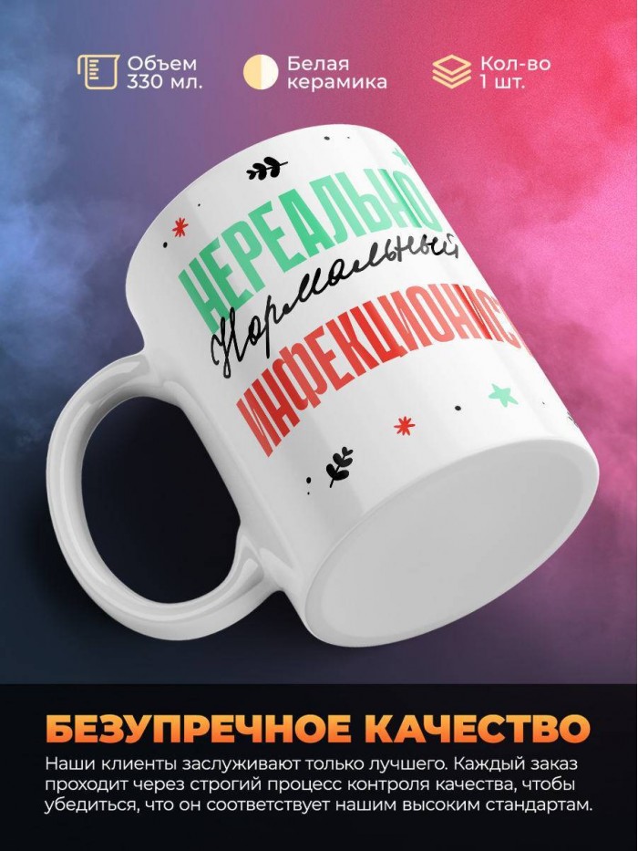 Сувенирная белая кружка с принтом "Нереально нормальный инфекционист" – отличный подарок родным и близким людям для любого случая. Уникальный дизайн делает ее неповторимой и привлекательной для глаз. Принты могут быть разными: от ярких креативных решений, которые идеально подойдут молодежи, до классических элегантных узоров, радующих взгляд людей любого поколения во время чаепития. Рисунок наносится с использованием специализированного оборудования, материалами, прошедшими испытания на пригодность к использованию в быту.