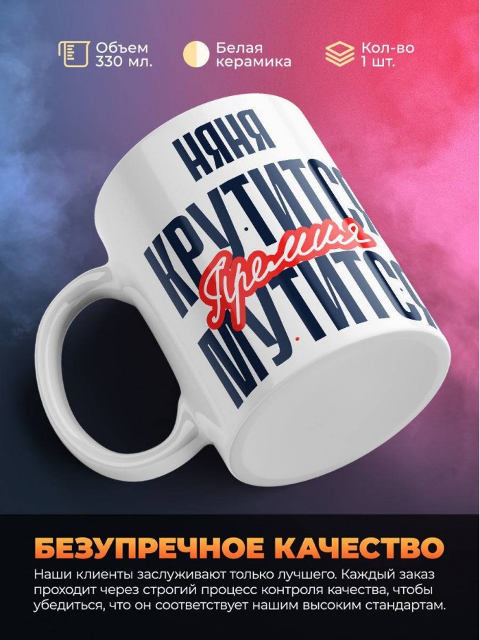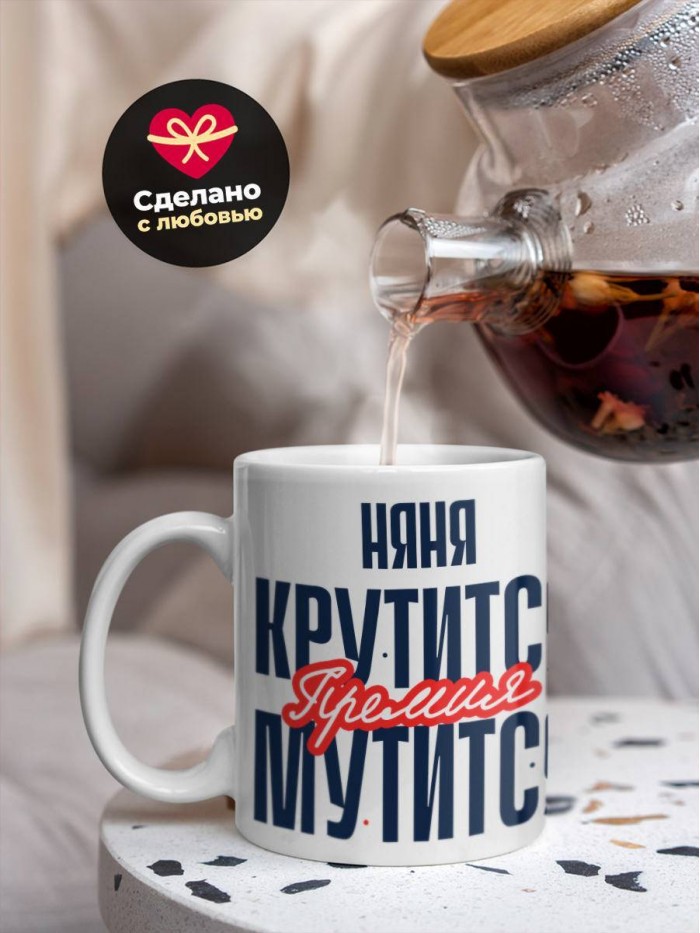Сувенирная белая кружка с принтом "Няня крутится премия мутится" – отличный подарок родным и близким людям для любого случая. Уникальный дизайн делает ее неповторимой и привлекательной для глаз. Принты могут быть разными: от ярких креативных решений, которые идеально подойдут молодежи, до классических элегантных узоров, радующих взгляд людей любого поколения во время чаепития. Рисунок наносится с использованием специализированного оборудования, материалами, прошедшими испытания на пригодность к использованию в быту.