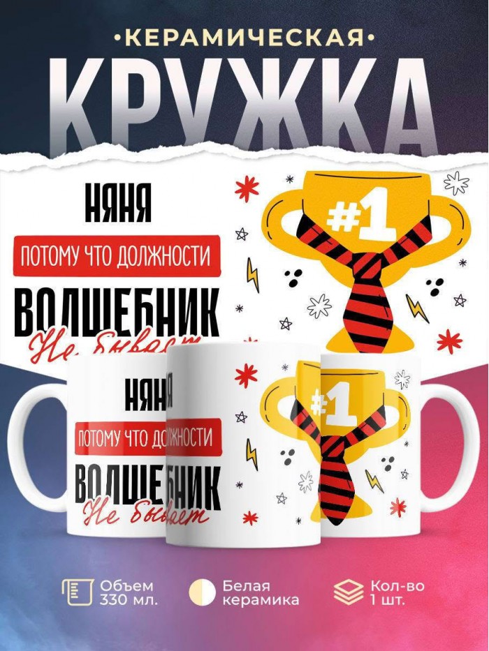 Сувенирная белая кружка с принтом "Няня, потому что должности волшебник не бывает" – отличный подарок родным и близким людям для любого случая. Уникальный дизайн делает ее неповторимой и привлекательной для глаз. Принты могут быть разными: от ярких креативных решений, которые идеально подойдут молодежи, до классических элегантных узоров, радующих взгляд людей любого поколения во время чаепития. Рисунок наносится с использованием специализированного оборудования, материалами, прошедшими испытания на пригодность к использованию в быту.
