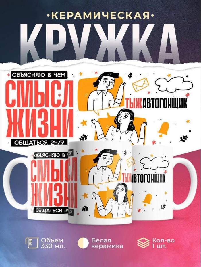 Сувенирная белая кружка с принтом "Объясняю в чем смысл жизни обращаться 24/7 тыжавтогонщик" – отличный подарок родным и близким людям для любого случая. Уникальный дизайн делает ее неповторимой и привлекательной для глаз. Принты могут быть разными: от ярких креативных решений, которые идеально подойдут молодежи, до классических элегантных узоров, радующих взгляд людей любого поколения во время чаепития. Рисунок наносится с использованием специализированного оборудования, материалами, прошедшими испытания на пригодность к использованию в быту.
