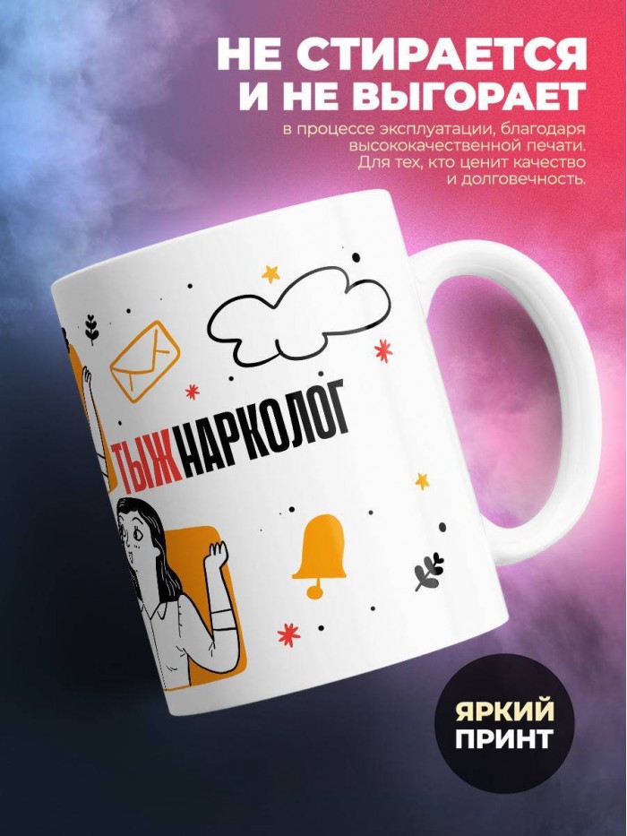 Сувенирная белая кружка с принтом "Объясняю в чем смысл жизни обращаться 24/7 тыжнарколог" – отличный подарок родным и близким людям для любого случая. Уникальный дизайн делает ее неповторимой и привлекательной для глаз. Принты могут быть разными: от ярких креативных решений, которые идеально подойдут молодежи, до классических элегантных узоров, радующих взгляд людей любого поколения во время чаепития. Рисунок наносится с использованием специализированного оборудования, материалами, прошедшими испытания на пригодность к использованию в быту.