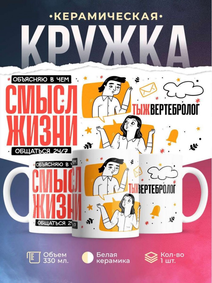 Сувенирная белая кружка с принтом "Объясняю в чем смысл жизни обращаться 24/7 тыжвертебролог" – отличный подарок родным и близким людям для любого случая. Уникальный дизайн делает ее неповторимой и привлекательной для глаз. Принты могут быть разными: от ярких креативных решений, которые идеально подойдут молодежи, до классических элегантных узоров, радующих взгляд людей любого поколения во время чаепития. Рисунок наносится с использованием специализированного оборудования, материалами, прошедшими испытания на пригодность к использованию в быту.