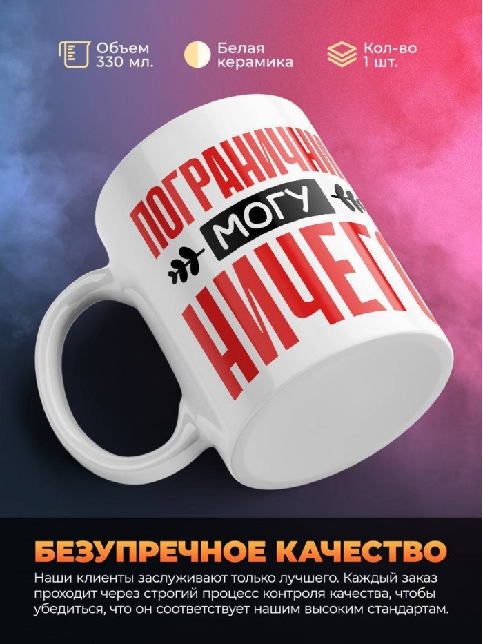 Сувенирная белая кружка с принтом "Пограничник могу ничего" – отличный подарок родным и близким людям для любого случая. Уникальный дизайн делает ее неповторимой и привлекательной для глаз. Принты могут быть разными: от ярких креативных решений, которые идеально подойдут молодежи, до классических элегантных узоров, радующих взгляд людей любого поколения во время чаепития. Рисунок наносится с использованием специализированного оборудования, материалами, прошедшими испытания на пригодность к использованию в быту.
