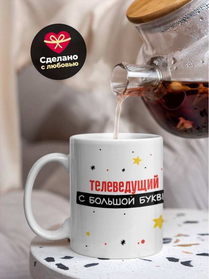 Сувенирная белая кружка с принтом "Телеведущий с большой буквы" – отличный подарок родным и близким людям для любого случая. Уникальный дизайн делает ее неповторимой и привлекательной для глаз. Принты могут быть разными: от ярких креативных решений, которые идеально подойдут молодежи, до классических элегантных узоров, радующих взгляд людей любого поколения во время чаепития. Рисунок наносится с использованием специализированного оборудования, материалами, прошедшими испытания на пригодность к использованию в быту.