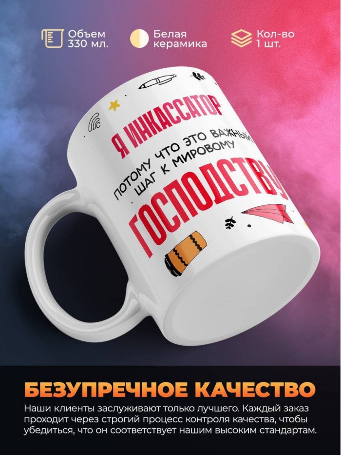 Сувенирная белая кружка с принтом "Я инкассатор, потому что это важный шаг к мировому господству" – отличный подарок родным и близким людям для любого случая. Уникальный дизайн делает ее неповторимой и привлекательной для глаз. Принты могут быть разными: от ярких креативных решений, которые идеально подойдут молодежи, до классических элегантных узоров, радующих взгляд людей любого поколения во время чаепития. Рисунок наносится с использованием специализированного оборудования, материалами, прошедшими испытания на пригодность к использованию в быту.