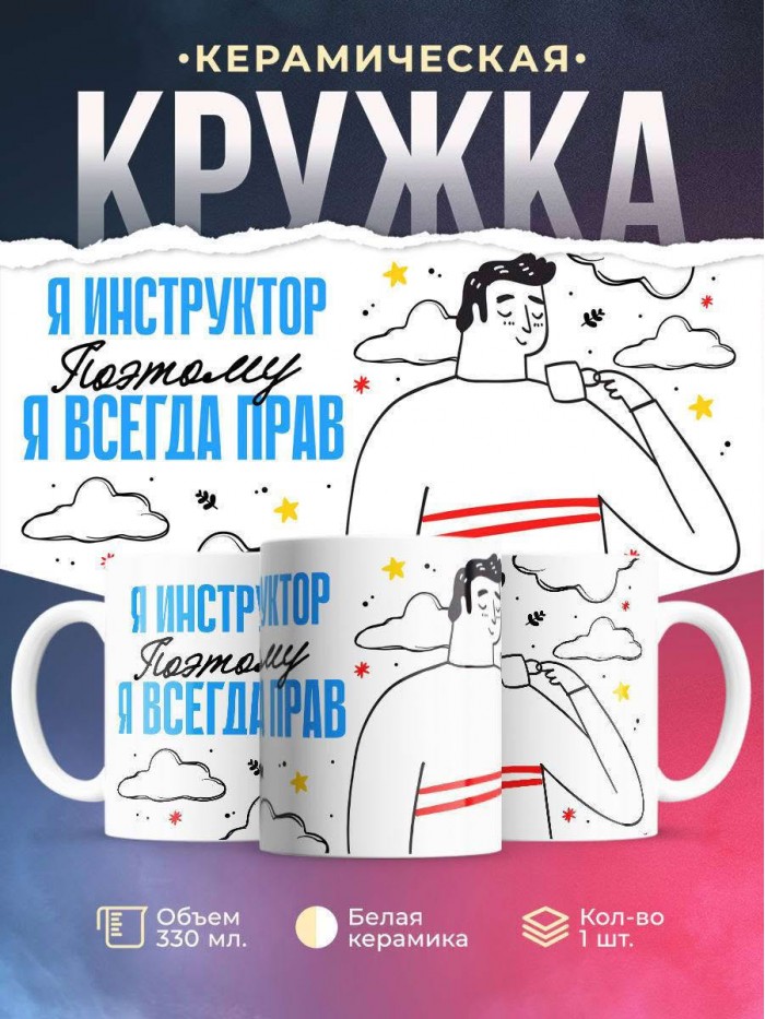 Сувенирная белая кружка с принтом "Я инструктор поэтому я всегда прав" – отличный подарок родным и близким людям для любого случая. Уникальный дизайн делает ее неповторимой и привлекательной для глаз. Принты могут быть разными: от ярких креативных решений, которые идеально подойдут молодежи, до классических элегантных узоров, радующих взгляд людей любого поколения во время чаепития. Рисунок наносится с использованием специализированного оборудования, материалами, прошедшими испытания на пригодность к использованию в быту.