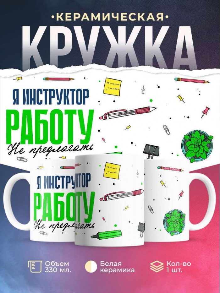 Сувенирная белая кружка с принтом "Я инструктор работу не предлагать" – отличный подарок родным и близким людям для любого случая. Уникальный дизайн делает ее неповторимой и привлекательной для глаз. Принты могут быть разными: от ярких креативных решений, которые идеально подойдут молодежи, до классических элегантных узоров, радующих взгляд людей любого поколения во время чаепития. Рисунок наносится с использованием специализированного оборудования, материалами, прошедшими испытания на пригодность к использованию в быту.