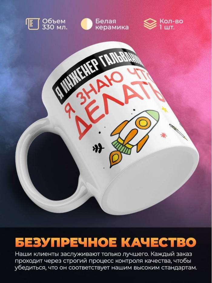 Сувенирная белая кружка с принтом "Я инженер гальваник я знаю, что делать" – отличный подарок родным и близким людям для любого случая. Уникальный дизайн делает ее неповторимой и привлекательной для глаз. Принты могут быть разными: от ярких креативных решений, которые идеально подойдут молодежи, до классических элегантных узоров, радующих взгляд людей любого поколения во время чаепития. Рисунок наносится с использованием специализированного оборудования, материалами, прошедшими испытания на пригодность к использованию в быту.