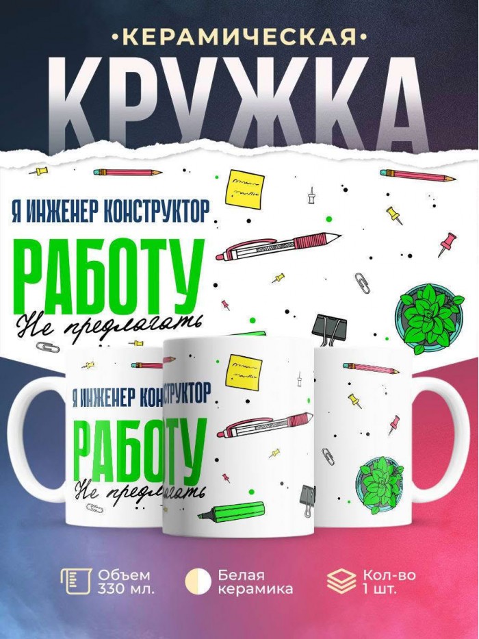 Сувенирная белая кружка с принтом "Я инженер конструктор работу не предлагать" – отличный подарок родным и близким людям для любого случая. Уникальный дизайн делает ее неповторимой и привлекательной для глаз. Принты могут быть разными: от ярких креативных решений, которые идеально подойдут молодежи, до классических элегантных узоров, радующих взгляд людей любого поколения во время чаепития. Рисунок наносится с использованием специализированного оборудования, материалами, прошедшими испытания на пригодность к использованию в быту.