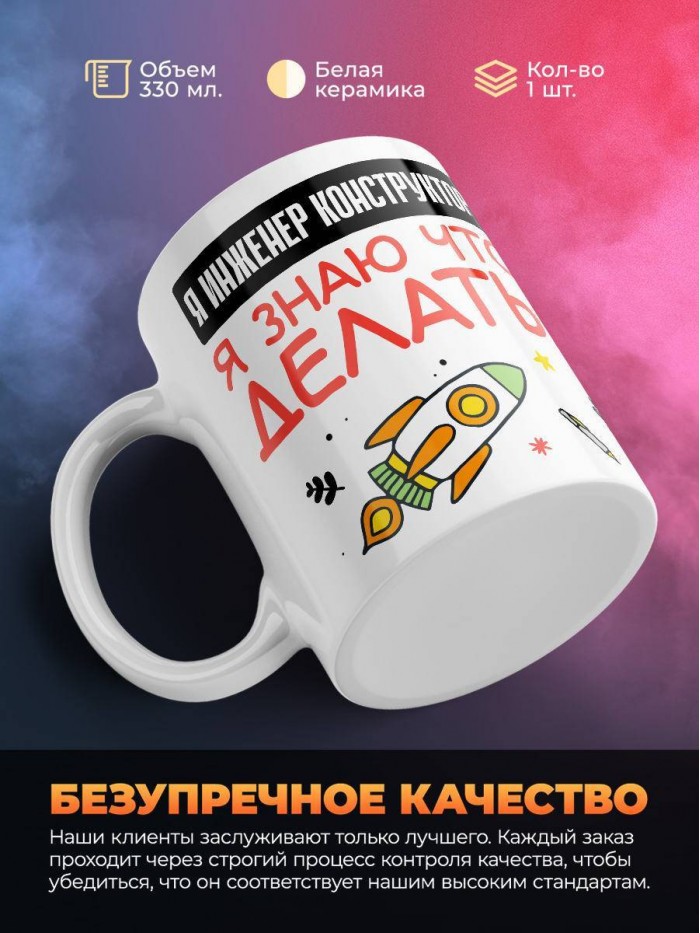 Сувенирная белая кружка с принтом "Я инженер конструктор я знаю, что делать" – отличный подарок родным и близким людям для любого случая. Уникальный дизайн делает ее неповторимой и привлекательной для глаз. Принты могут быть разными: от ярких креативных решений, которые идеально подойдут молодежи, до классических элегантных узоров, радующих взгляд людей любого поколения во время чаепития. Рисунок наносится с использованием специализированного оборудования, материалами, прошедшими испытания на пригодность к использованию в быту.