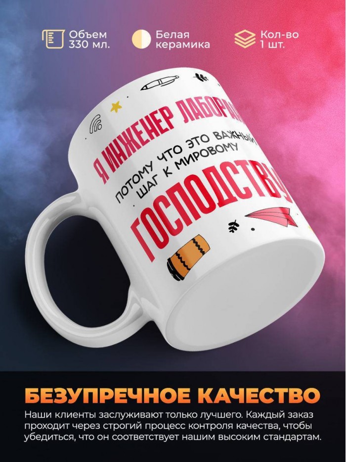 Сувенирная белая кружка с принтом "Я инженер лаборант, потому что это важный шаг к мировому господству" – отличный подарок родным и близким людям для любого случая. Уникальный дизайн делает ее неповторимой и привлекательной для глаз. Принты могут быть разными: от ярких креативных решений, которые идеально подойдут молодежи, до классических элегантных узоров, радующих взгляд людей любого поколения во время чаепития. Рисунок наносится с использованием специализированного оборудования, материалами, прошедшими испытания на пригодность к использованию в быту.