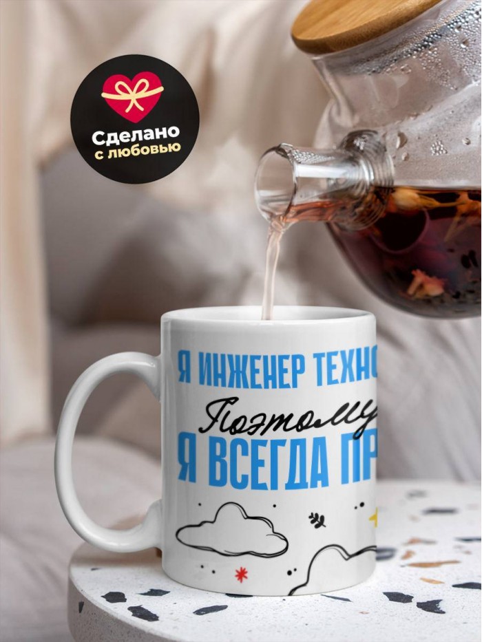 Сувенирная белая кружка с принтом "Я инженер технолог поэтому я всегда прав" – отличный подарок родным и близким людям для любого случая. Уникальный дизайн делает ее неповторимой и привлекательной для глаз. Принты могут быть разными: от ярких креативных решений, которые идеально подойдут молодежи, до классических элегантных узоров, радующих взгляд людей любого поколения во время чаепития. Рисунок наносится с использованием специализированного оборудования, материалами, прошедшими испытания на пригодность к использованию в быту.