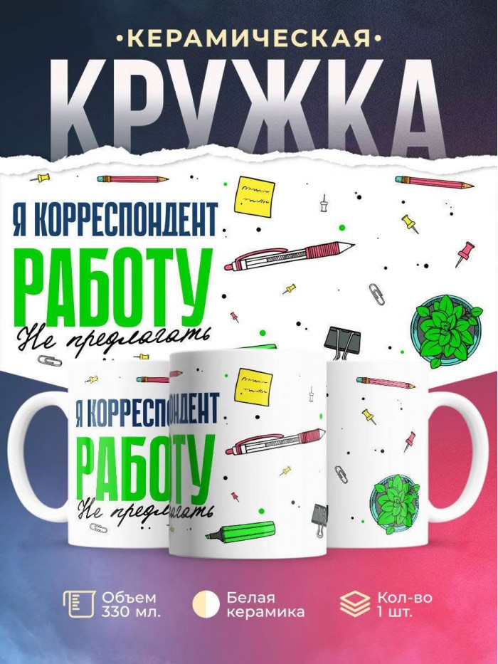 Сувенирная белая кружка с принтом "Я корреспондент работу не предлагать" – отличный подарок родным и близким людям для любого случая. Уникальный дизайн делает ее неповторимой и привлекательной для глаз. Принты могут быть разными: от ярких креативных решений, которые идеально подойдут молодежи, до классических элегантных узоров, радующих взгляд людей любого поколения во время чаепития. Рисунок наносится с использованием специализированного оборудования, материалами, прошедшими испытания на пригодность к использованию в быту.
