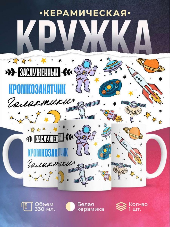 Сувенирная белая кружка с принтом "Заслуженный кромкозакатчик галактики" – отличный подарок родным и близким людям для любого случая. Уникальный дизайн делает ее неповторимой и привлекательной для глаз. Принты могут быть разными: от ярких креативных решений, которые идеально подойдут молодежи, до классических элегантных узоров, радующих взгляд людей любого поколения во время чаепития. Рисунок наносится с использованием специализированного оборудования, материалами, прошедшими испытания на пригодность к использованию в быту.