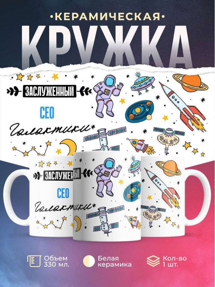 Сувенирная белая кружка с принтом "Заслуженный сео галактики" – отличный подарок родным и близким людям для любого случая. Уникальный дизайн делает ее неповторимой и привлекательной для глаз. Принты могут быть разными: от ярких креативных решений, которые идеально подойдут молодежи, до классических элегантных узоров, радующих взгляд людей любого поколения во время чаепития. Рисунок наносится с использованием специализированного оборудования, материалами, прошедшими испытания на пригодность к использованию в быту.
