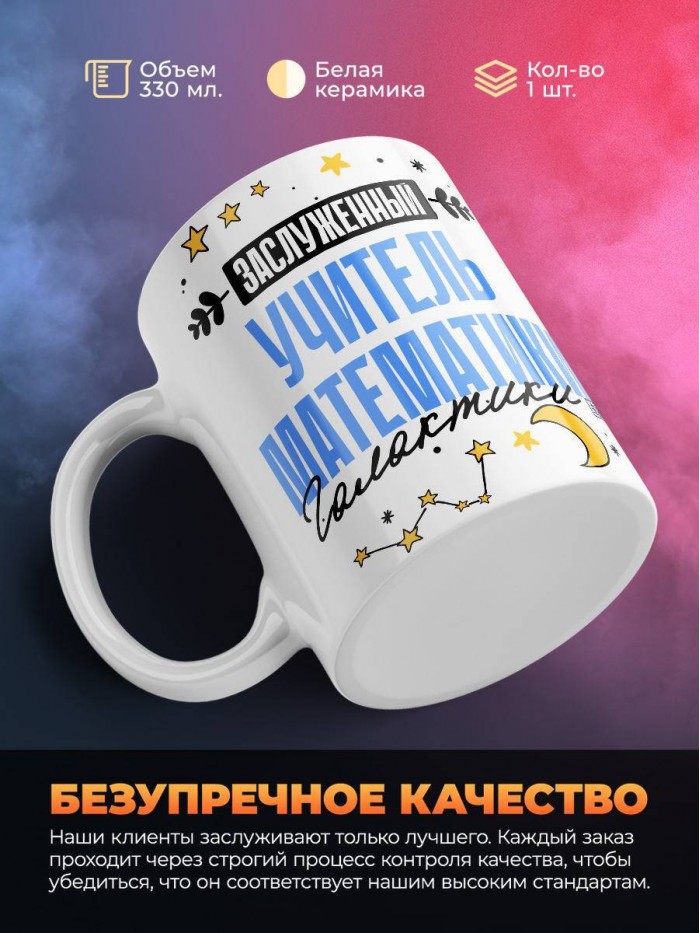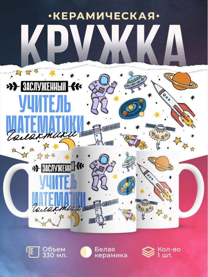 Сувенирная белая кружка с принтом "Заслуженный учитель математики галактики" – отличный подарок родным и близким людям для любого случая. Уникальный дизайн делает ее неповторимой и привлекательной для глаз. Принты могут быть разными: от ярких креативных решений, которые идеально подойдут молодежи, до классических элегантных узоров, радующих взгляд людей любого поколения во время чаепития. Рисунок наносится с использованием специализированного оборудования, материалами, прошедшими испытания на пригодность к использованию в быту.