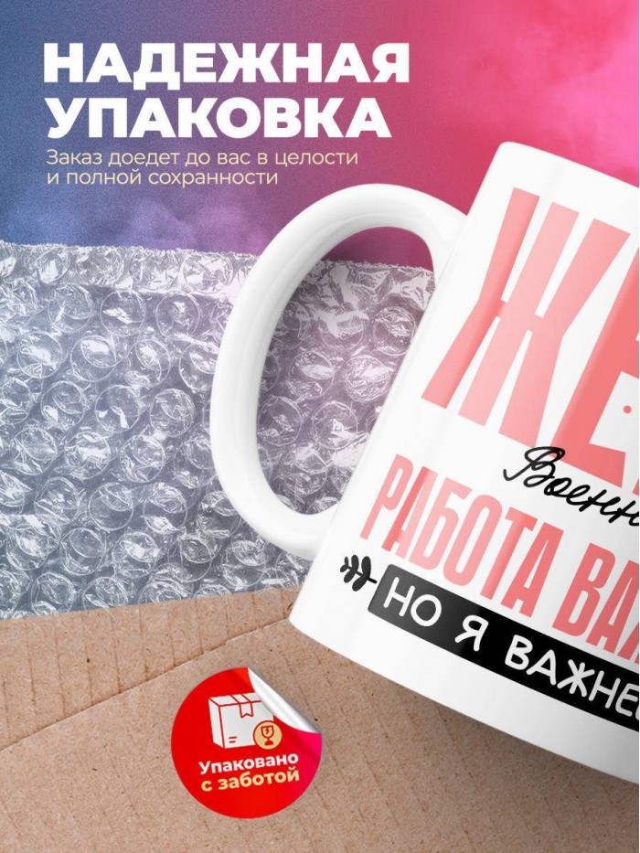 Сувенирная белая кружка с принтом "Жена военного работа важна, но я важнее" – отличный подарок родным и близким людям для любого случая. Уникальный дизайн делает ее неповторимой и привлекательной для глаз. Принты могут быть разными: от ярких креативных решений, которые идеально подойдут молодежи, до классических элегантных узоров, радующих взгляд людей любого поколения во время чаепития. Рисунок наносится с использованием специализированного оборудования, материалами, прошедшими испытания на пригодность к использованию в быту.