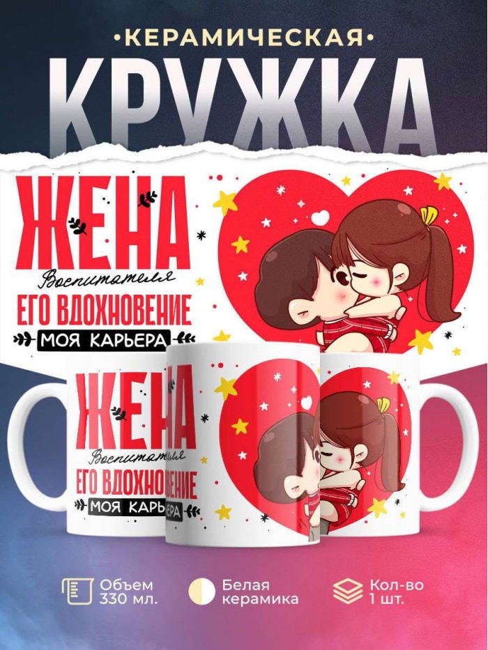 Сувенирная белая кружка с принтом "Жена воспитателя его вдохновение моя карьера" – отличный подарок родным и близким людям для любого случая. Уникальный дизайн делает ее неповторимой и привлекательной для глаз. Принты могут быть разными: от ярких креативных решений, которые идеально подойдут молодежи, до классических элегантных узоров, радующих взгляд людей любого поколения во время чаепития. Рисунок наносится с использованием специализированного оборудования, материалами, прошедшими испытания на пригодность к использованию в быту.