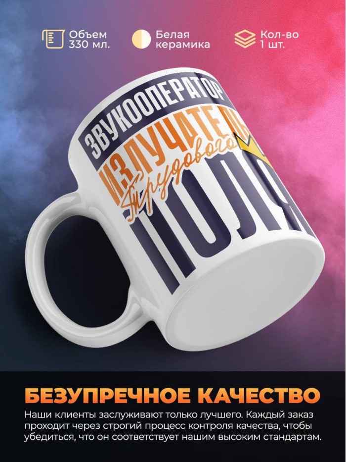 Сувенирная белая кружка с принтом "Звукооператор излучатель трудового поля" – отличный подарок родным и близким людям для любого случая. Уникальный дизайн делает ее неповторимой и привлекательной для глаз. Принты могут быть разными: от ярких креативных решений, которые идеально подойдут молодежи, до классических элегантных узоров, радующих взгляд людей любого поколения во время чаепития. Рисунок наносится с использованием специализированного оборудования, материалами, прошедшими испытания на пригодность к использованию в быту.
